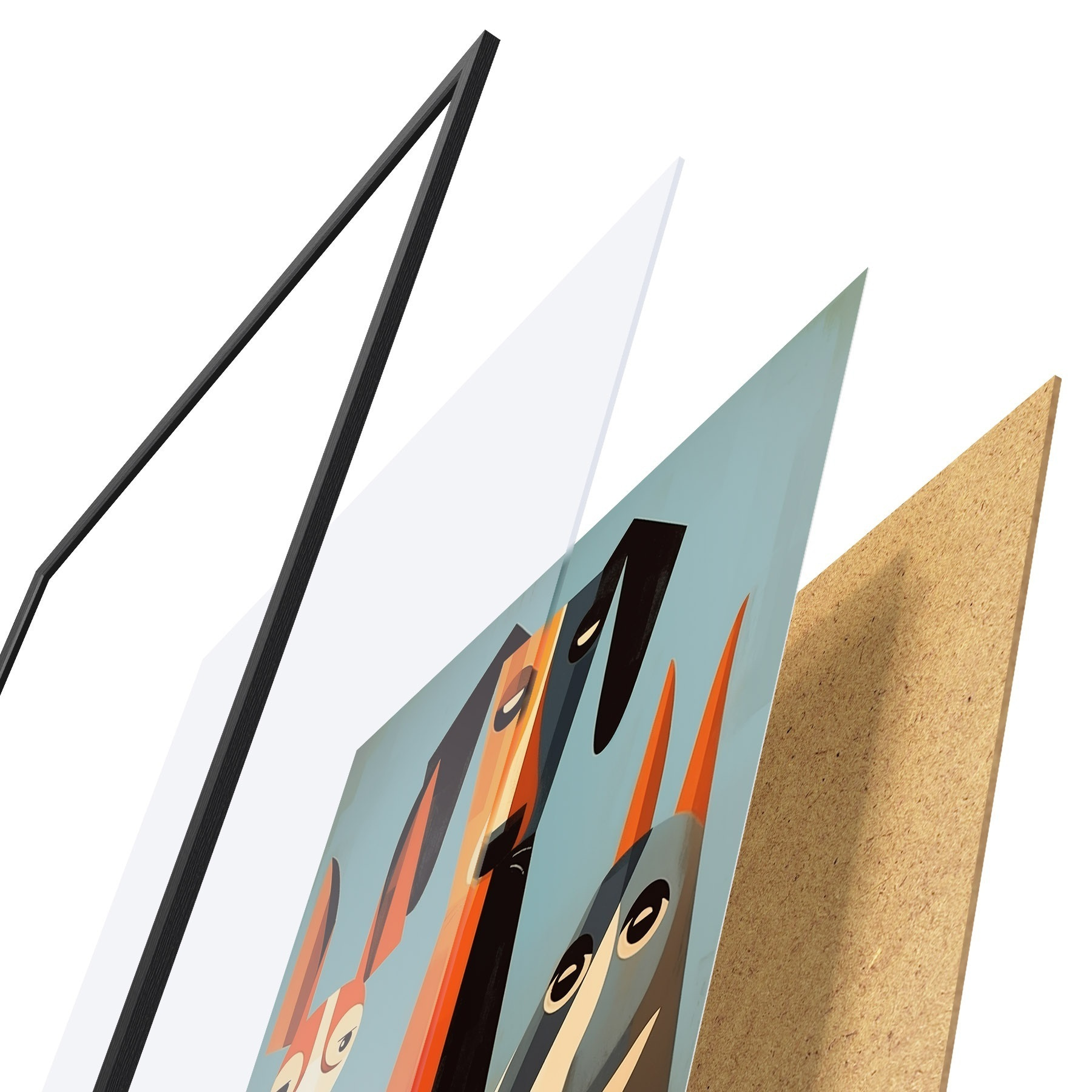 L’affiche encadrée est composée d’un cadre, d’un plexiglas, d’une image imprimée et d’un support en aggloméré. Elle est prête à être accrochée au mur grâce aux fixations situées à l’arrière.