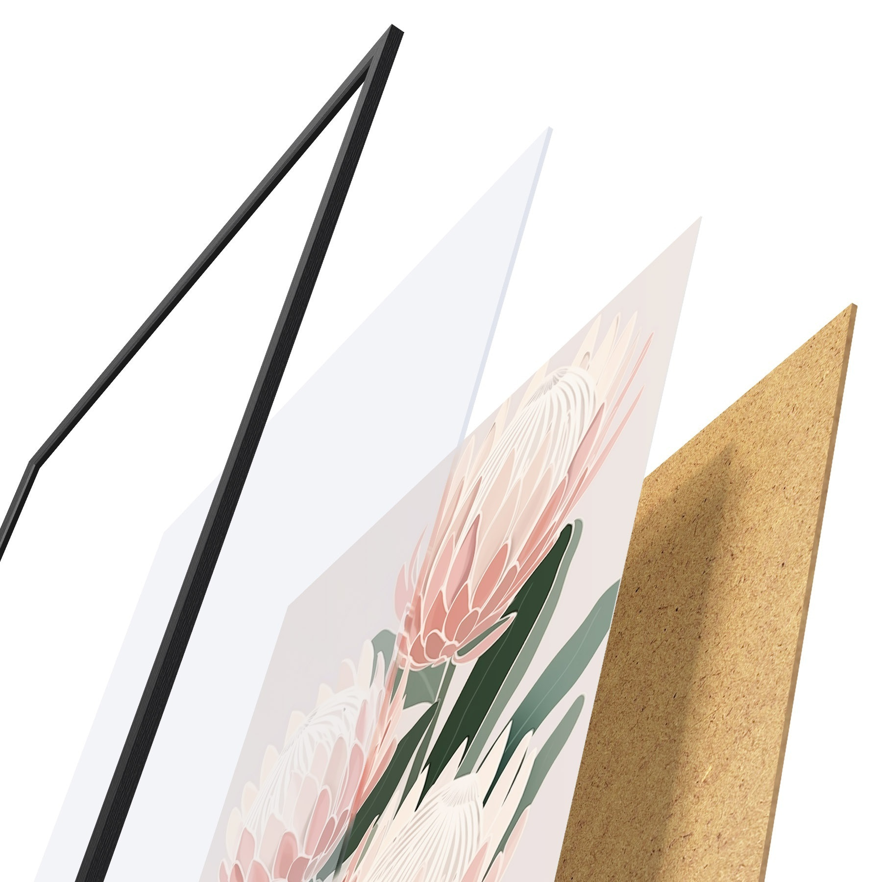 L’affiche encadrée est composée d’un cadre, d’un plexiglas, d’une image imprimée et d’un support en aggloméré. Elle est prête à être accrochée au mur grâce aux fixations situées à l’arrière.