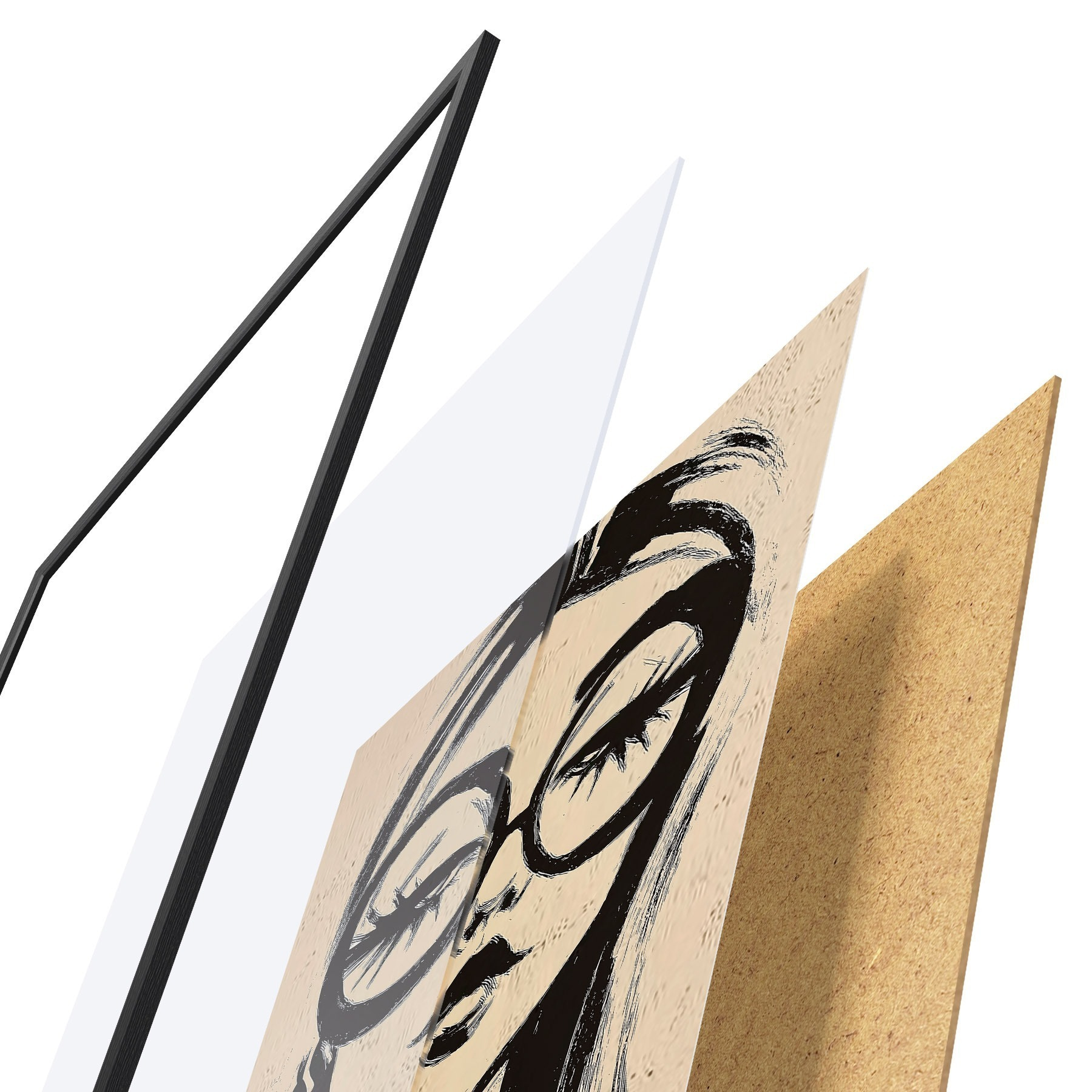 L’affiche encadrée est composée d’un cadre, d’un plexiglas, d’une image imprimée et d’un support en aggloméré. Elle est prête à être accrochée au mur grâce aux fixations situées à l’arrière.