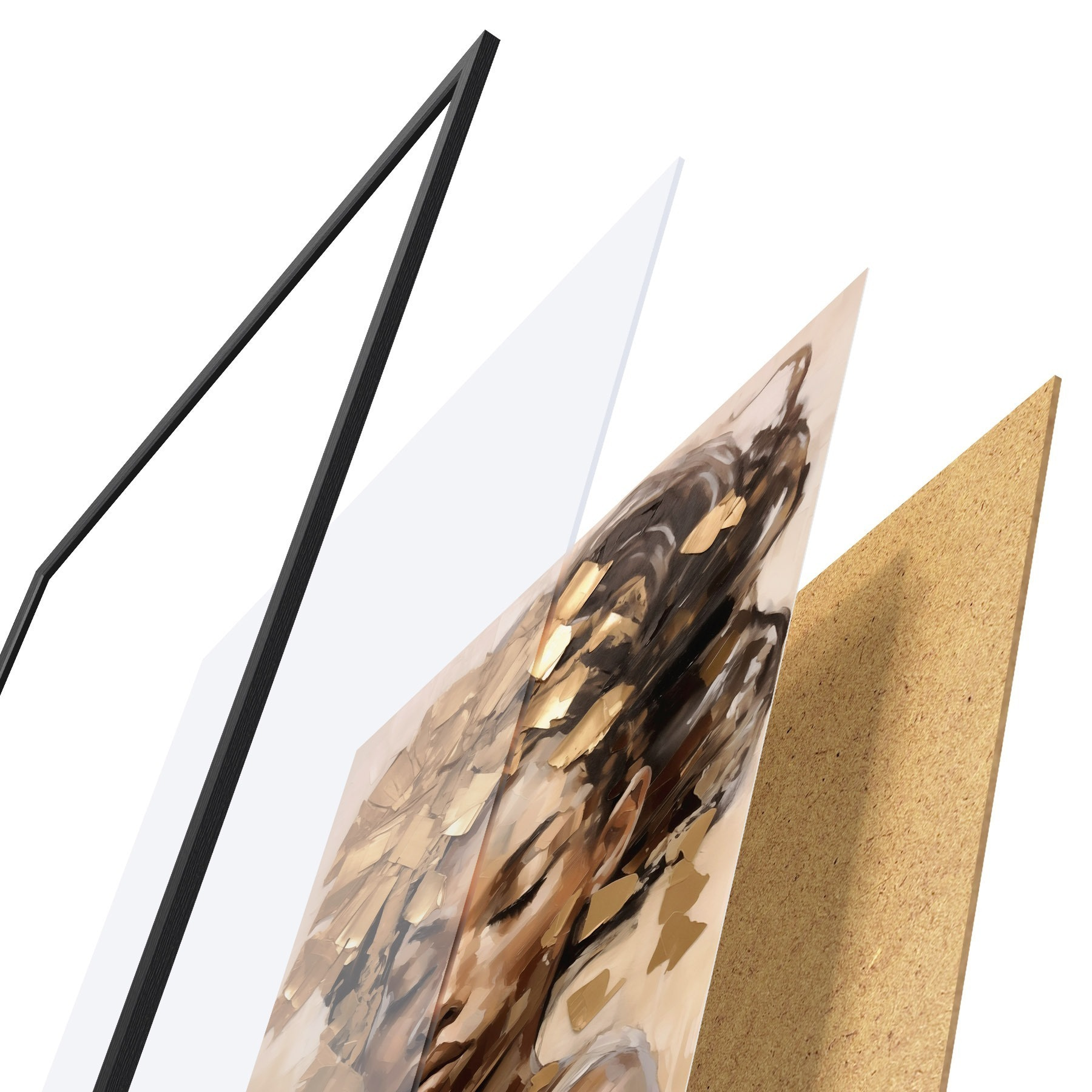 L’affiche encadrée est composée d’un cadre, d’un plexiglas, d’une image imprimée et d’un support en aggloméré. Elle est prête à être accrochée au mur grâce aux fixations situées à l’arrière.