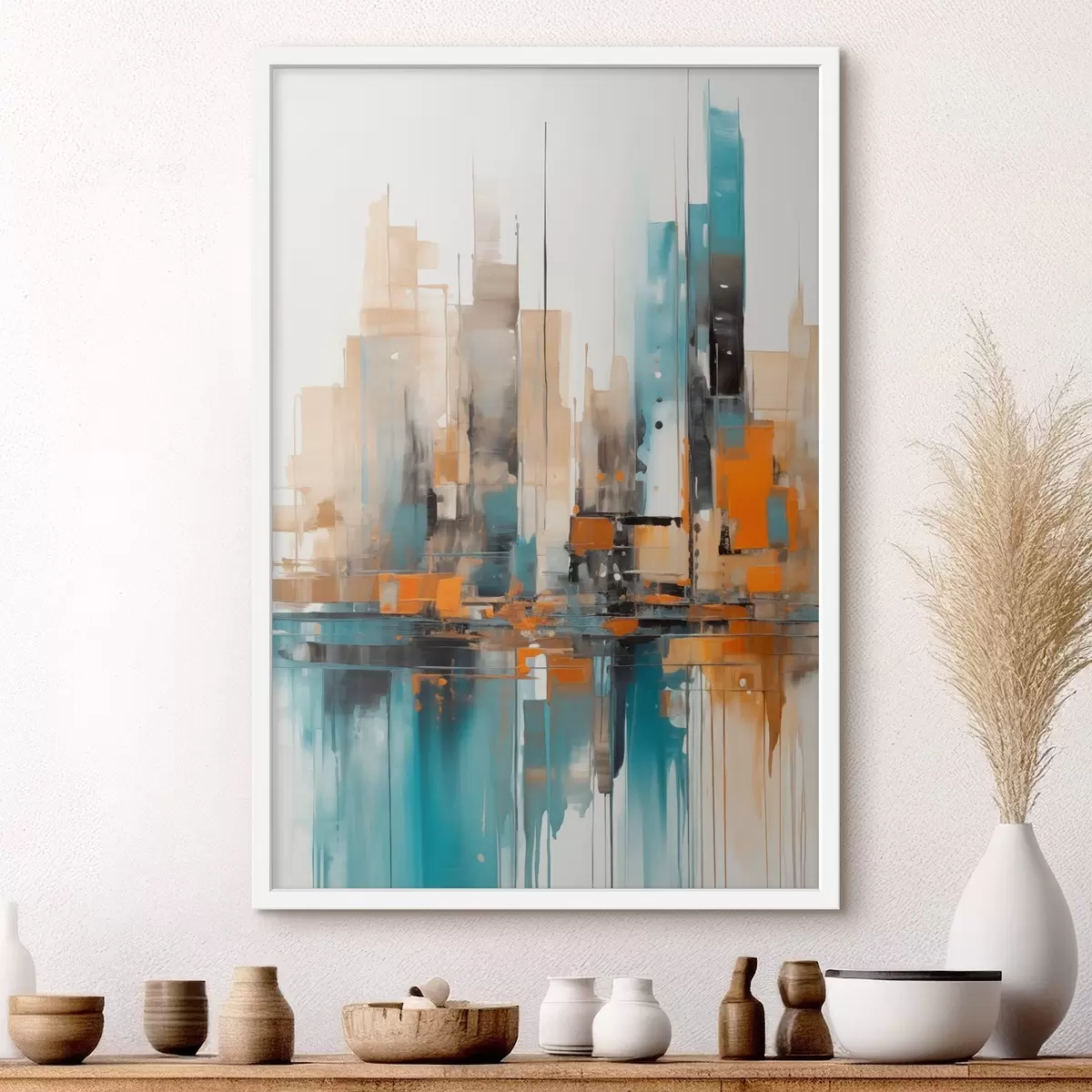Poster Paysage urbain abstrait avec des touches de couleur orange, bleu sarcelle et marron, des coups de pinceau verticaux et des formes géométriques Nr f46266