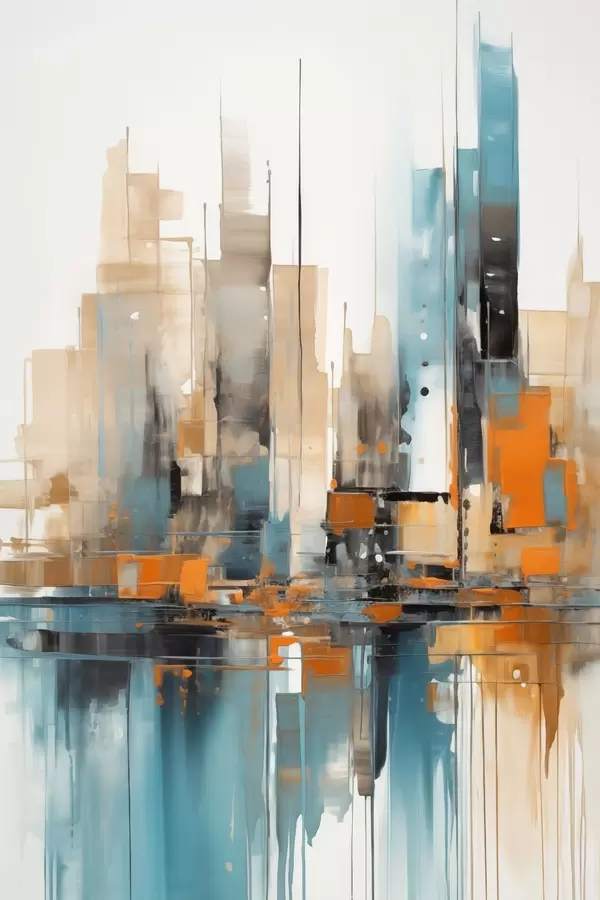 Poster Paysage urbain abstrait avec des touches de couleur orange, bleu sarcelle et marron, des coups de pinceau verticaux et des formes géométriques Nr f46266
