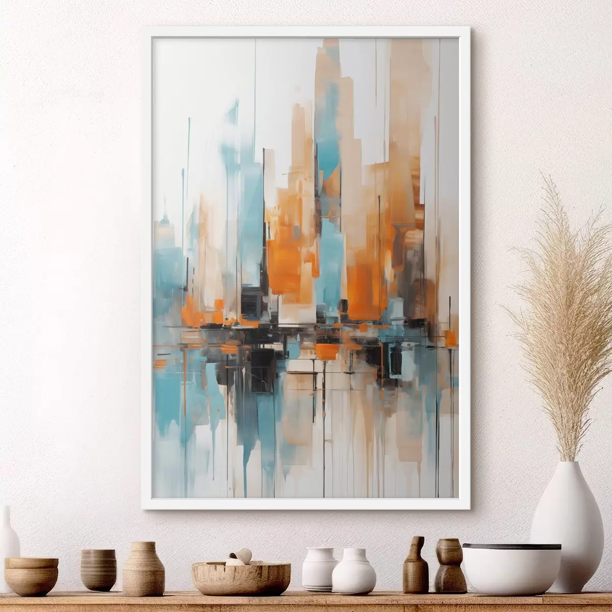 Poster Paysage urbain abstrait avec des coups de pinceau verticaux dans des tons orange, bleu et blanc, style pictural Nr f46267