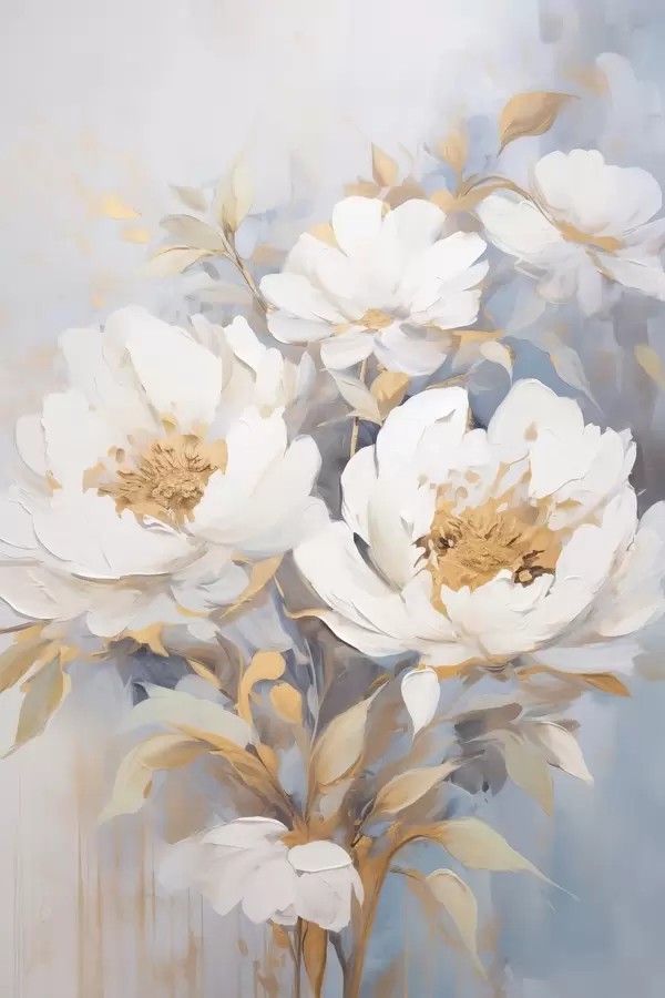 Poster Pivoines blanches avec cœur et feuilles bleus, coups de pinceau doux, fond bleu clair, composition florale Nr f46270