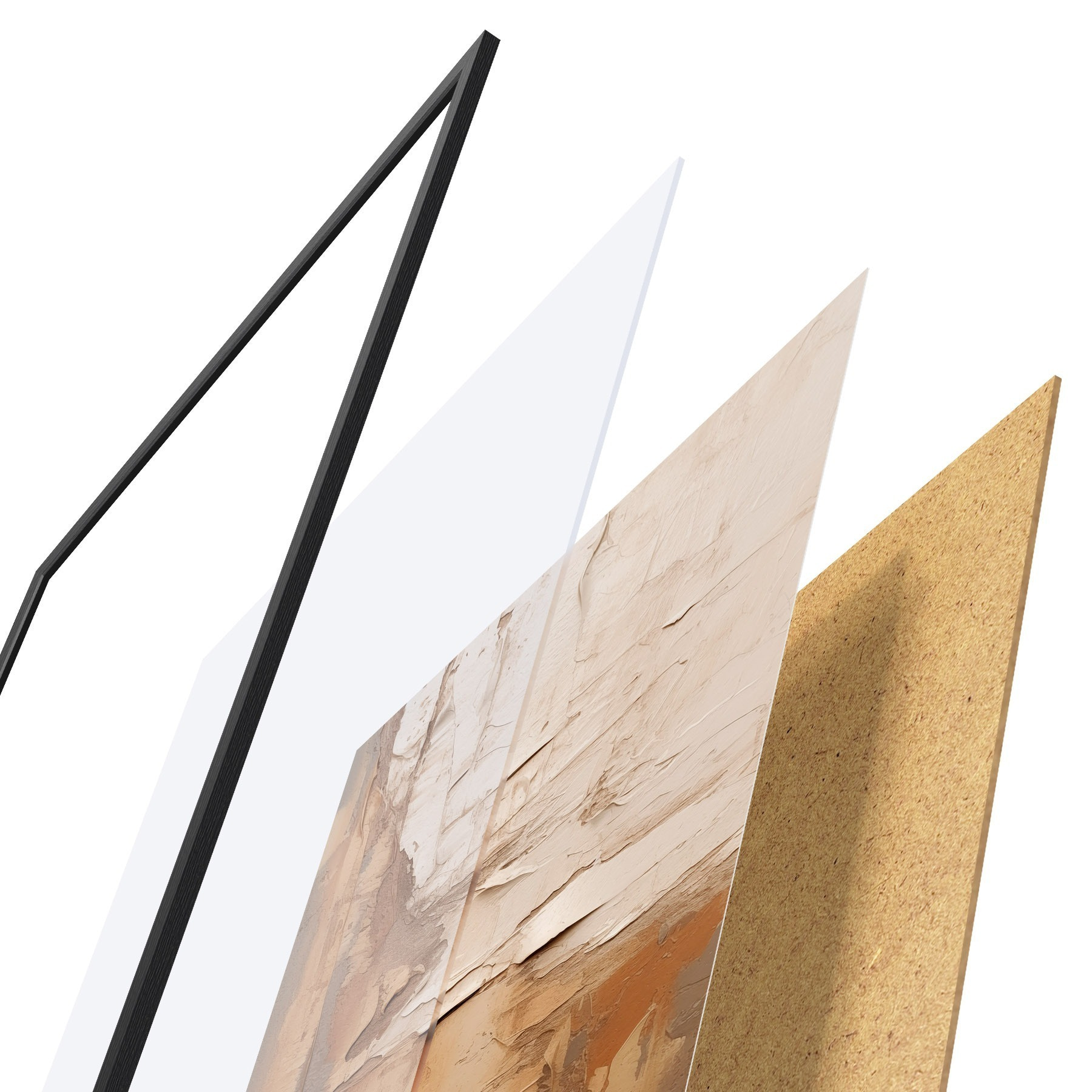 L’affiche encadrée est composée d’un cadre, d’un plexiglas, d’une image imprimée et d’un support en aggloméré. Elle est prête à être accrochée au mur grâce aux fixations situées à l’arrière.