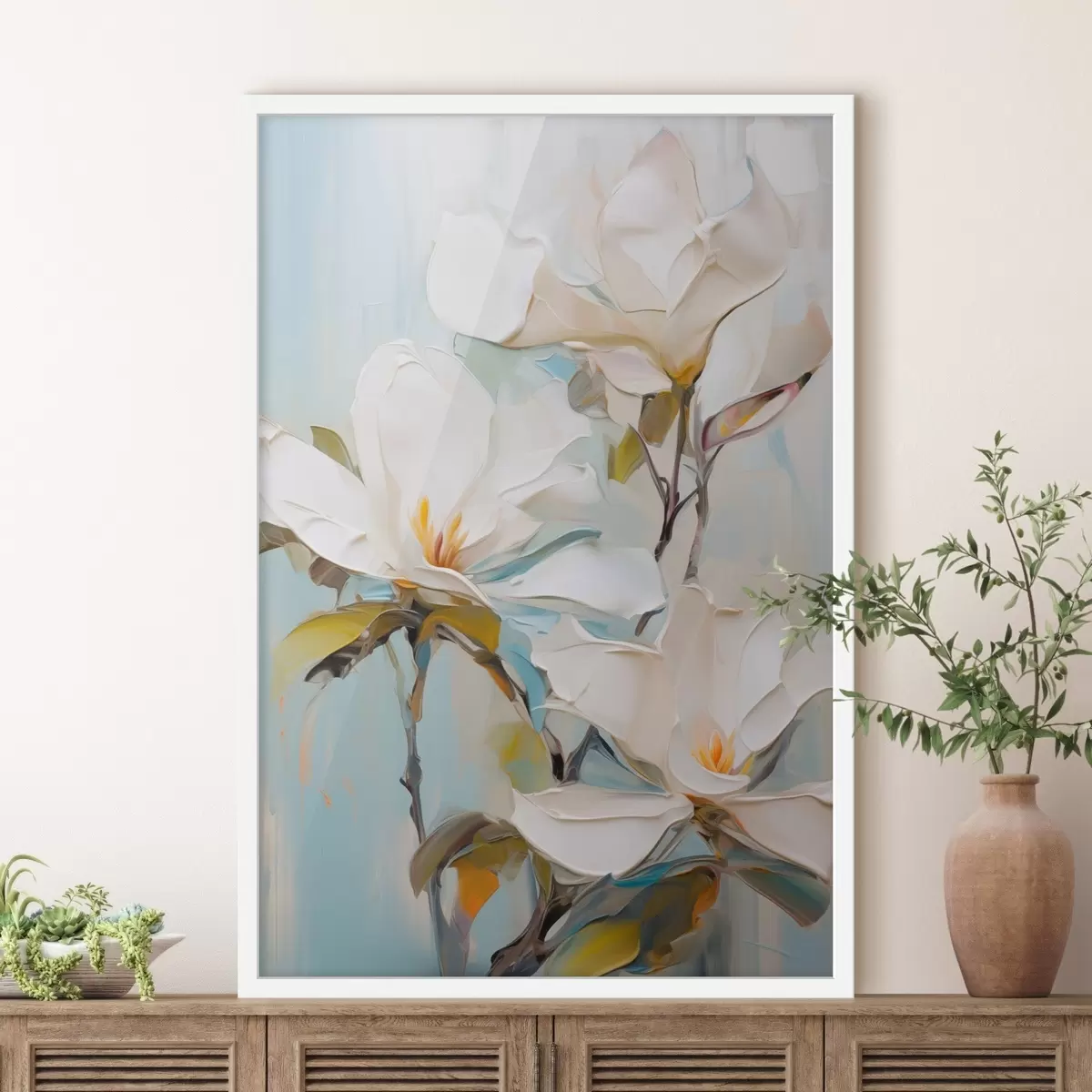 Poster Fleurs de magnolia blanches, fond bleu clair avec des coups de pinceau doux, style peinture à l'huile, texture impasto Nr f46276