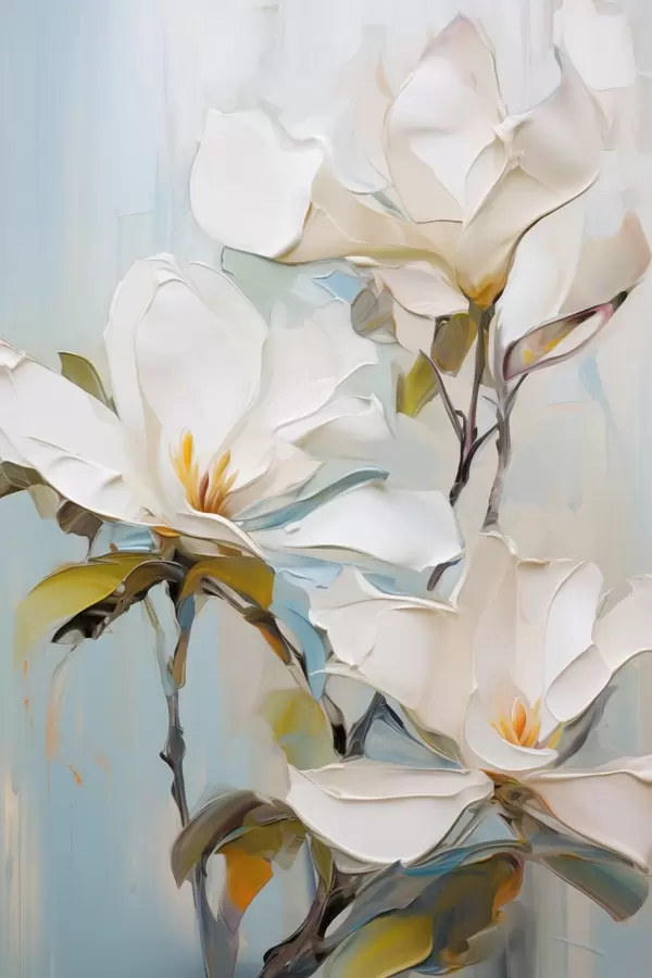 Poster Fleurs de magnolia blanches, fond bleu clair avec des coups de pinceau doux, style peinture à l'huile, texture impasto Nr f46276
