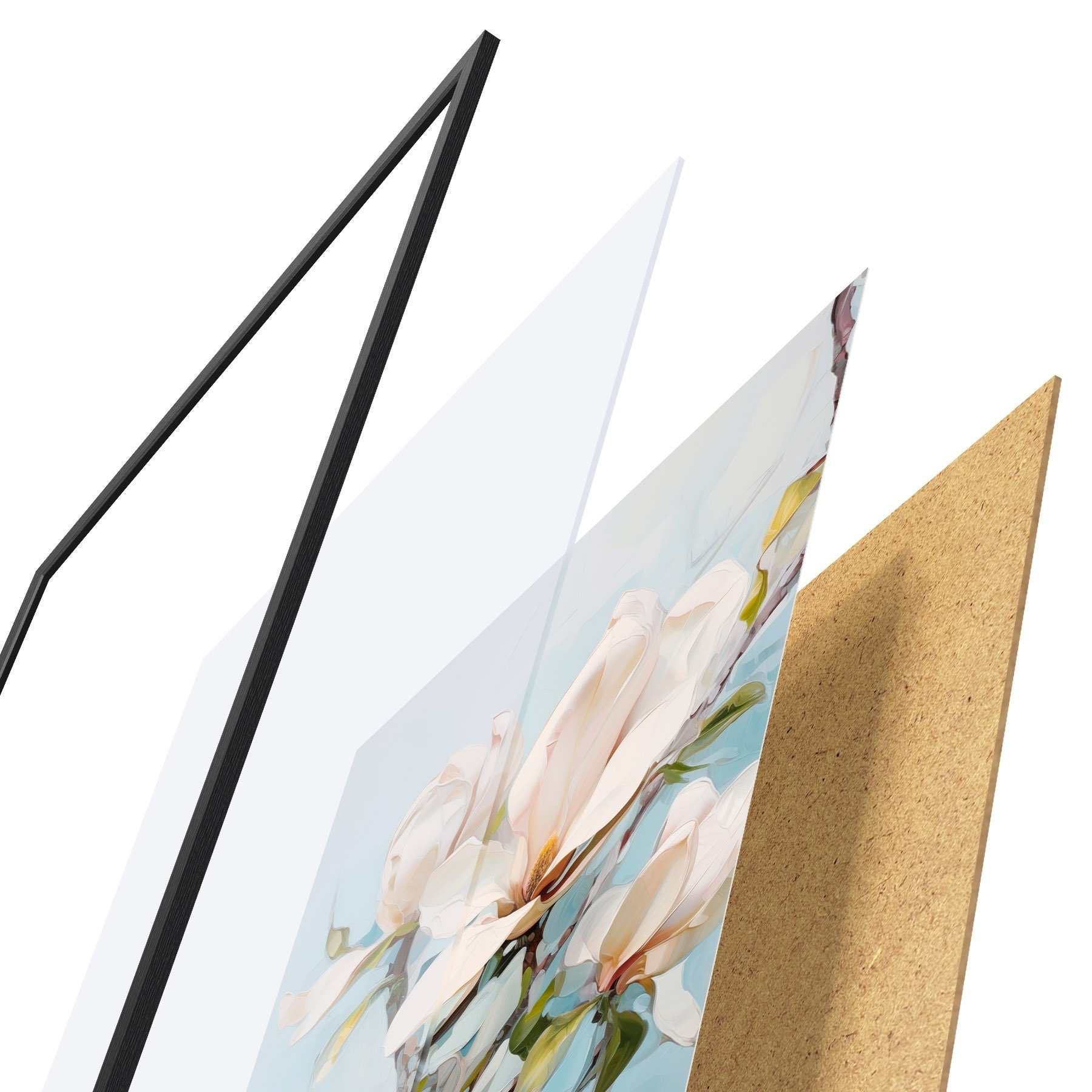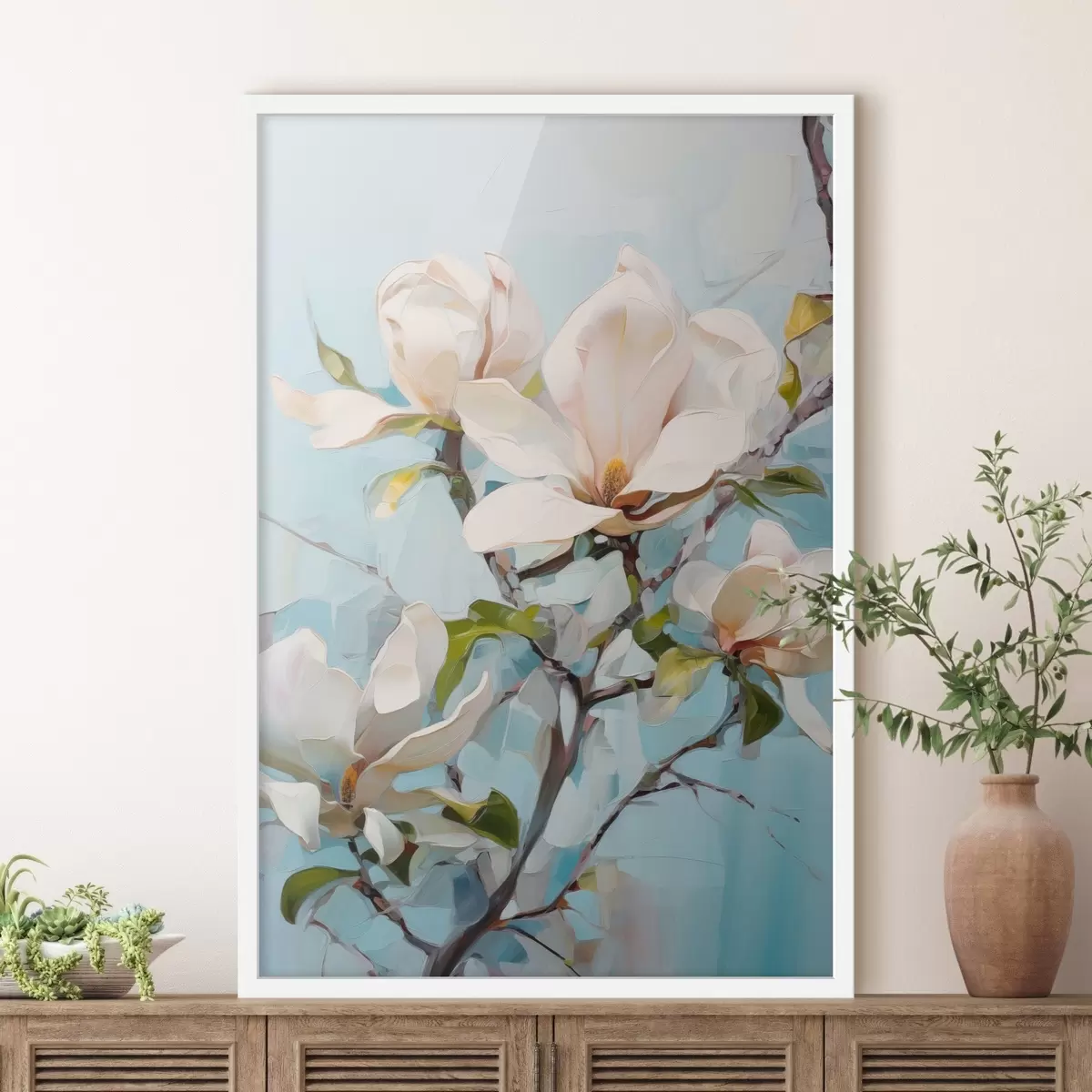 Poster Fleurs de magnolia blanches, fond bleu clair avec des coups de pinceau doux, style peinture à l'huile, texture impasto Nr f46277