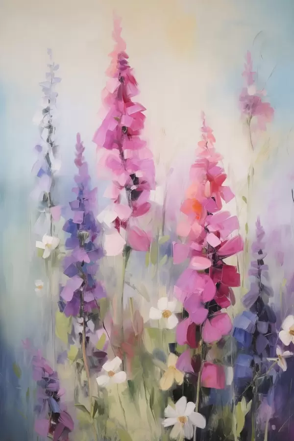 Poster Fleurs roses et violettes avec des marguerites blanches dans un champ, coups de pinceau doux, couleurs pastel, style impressionniste Nr f46279