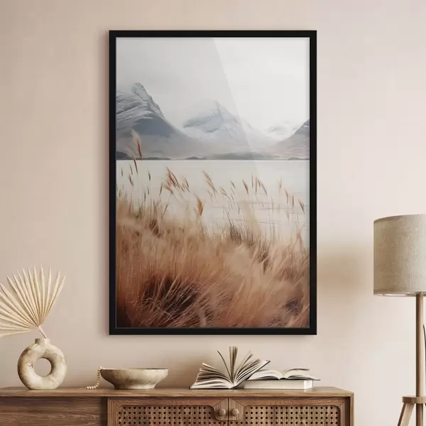 Poster Champ d'herbes de la pampa devant un paysage lacustre avec des montagnes enneigées en arrière-plan, lumière douce Nr f46282