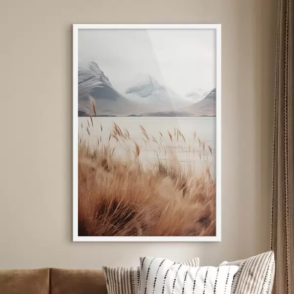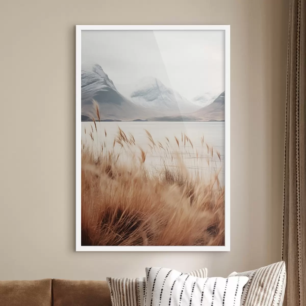 Poster Champ d'herbes de la pampa devant un paysage lacustre avec des montagnes enneigées en arrière-plan, lumière douce f46282