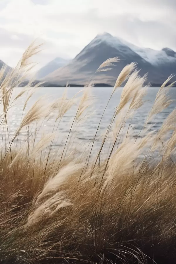 Poster Herbe de la pampa avec un lac et des montagnes en arrière-plan, éclairage tamisé, couleurs douces, style naturaliste Nr f46283