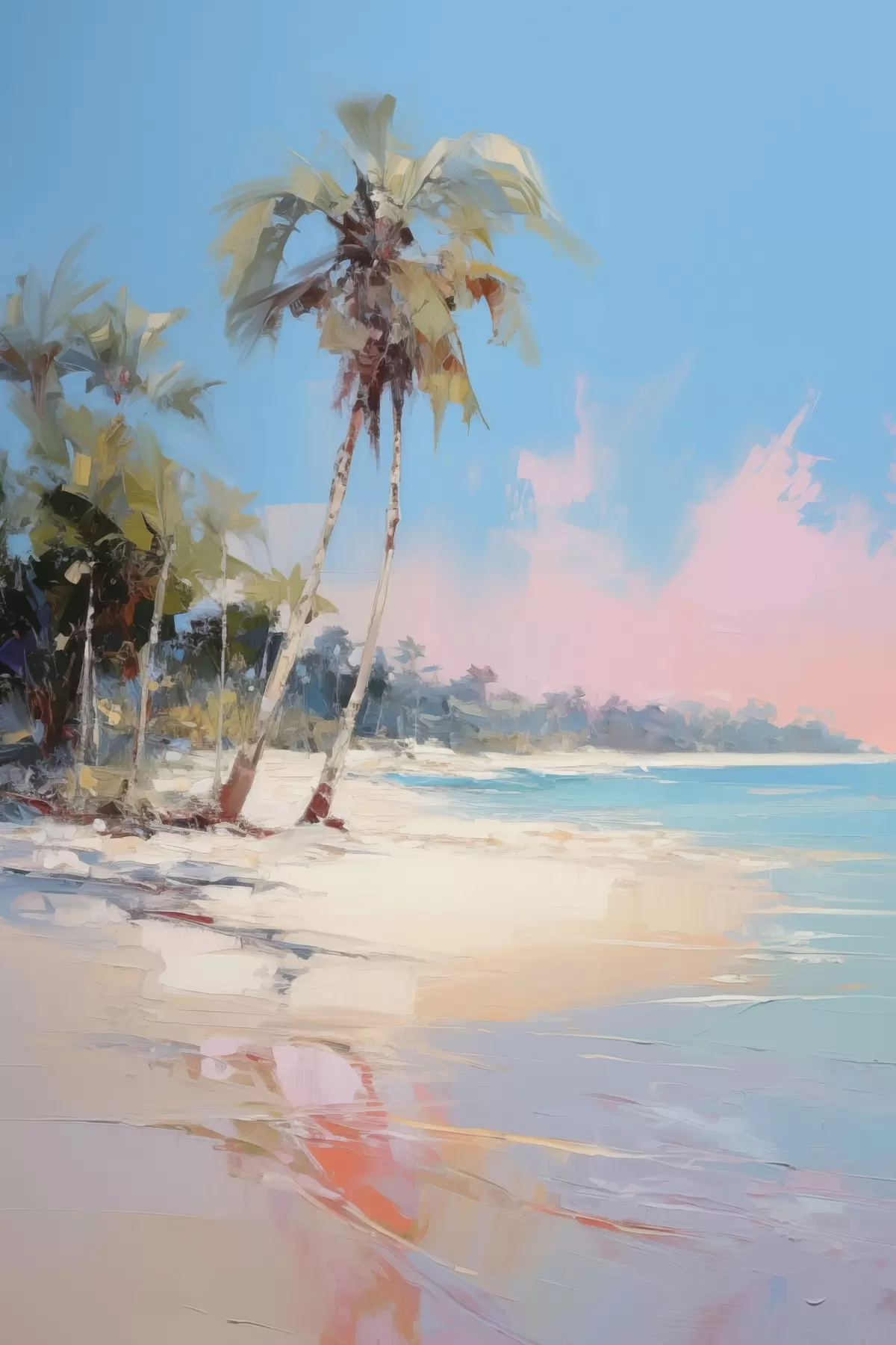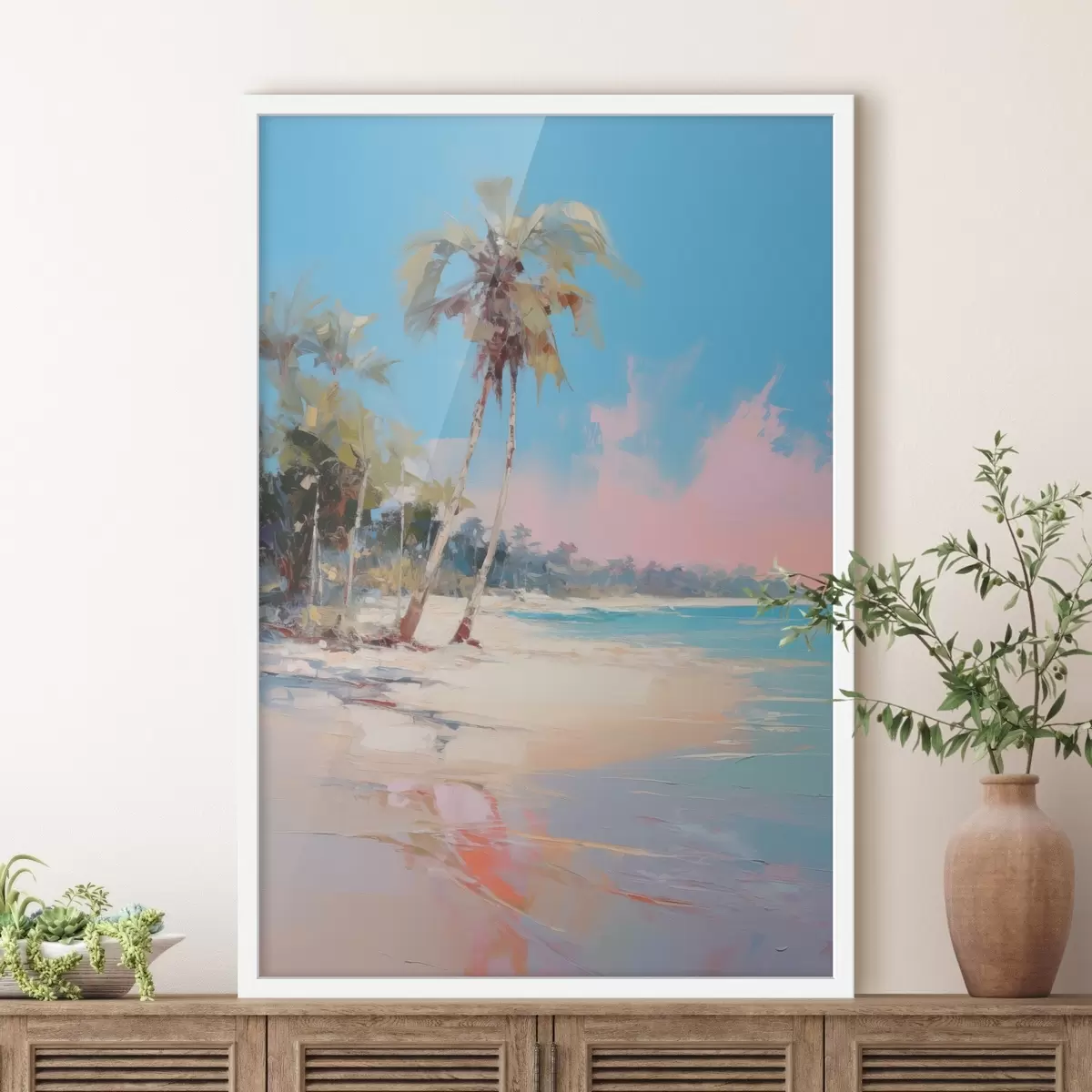 Poster Plage tropicale abstraite avec sable blanc et palmiers, ciel bleu avec nuages blancs Nr f46285