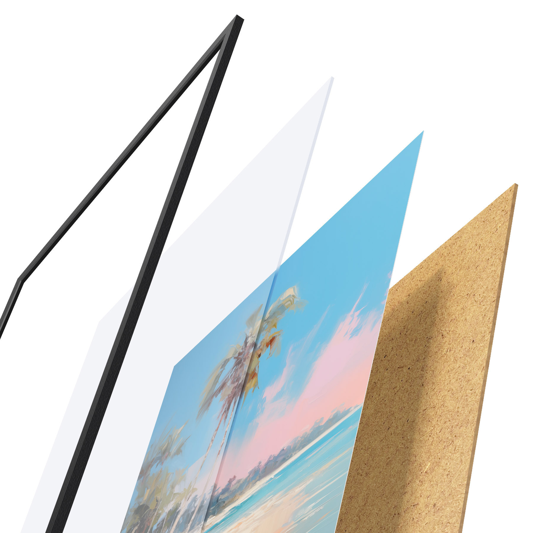 L’affiche encadrée est composée d’un cadre, d’un plexiglas, d’une image imprimée et d’un support en aggloméré. Elle est prête à être accrochée au mur grâce aux fixations situées à l’arrière.