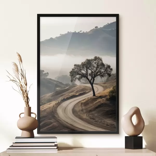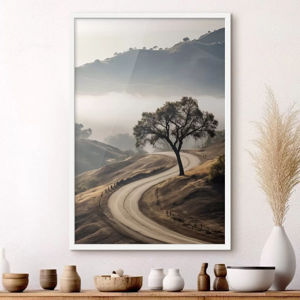 Poster Une route sinueuse à travers des collines vallonnées avec un arbre au premier plan, le fond avec du brouillard et des montagnes Nr f46288