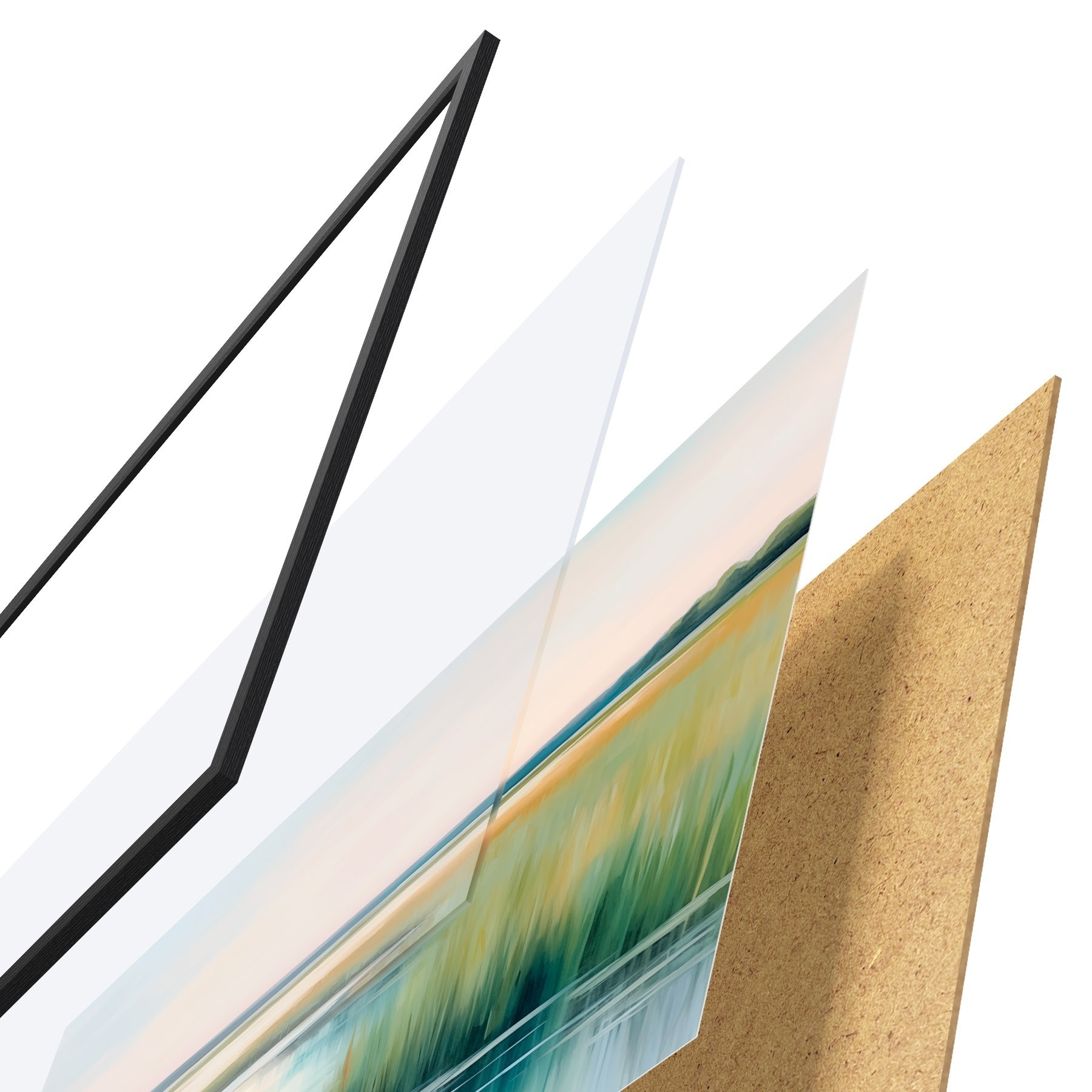 L’affiche encadrée est composée d’un cadre, d’un plexiglas, d’une image imprimée et d’un support en aggloméré. Elle est prête à être accrochée au mur grâce aux fixations situées à l’arrière.