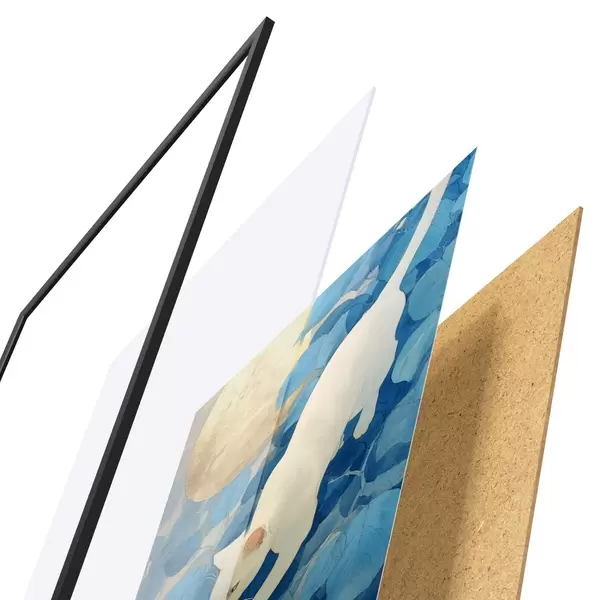 L’affiche encadrée est composée d’un cadre, d’un plexiglas, d’une image imprimée et d’un support en aggloméré. Elle est prête à être accrochée au mur grâce aux fixations situées à l’arrière.