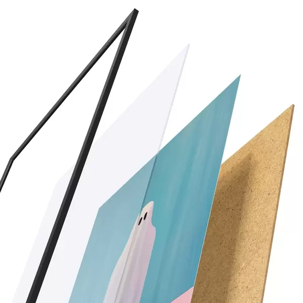 L’affiche encadrée est composée d’un cadre, d’un plexiglas, d’une image imprimée et d’un support en aggloméré. Elle est prête à être accrochée au mur grâce aux fixations situées à l’arrière.