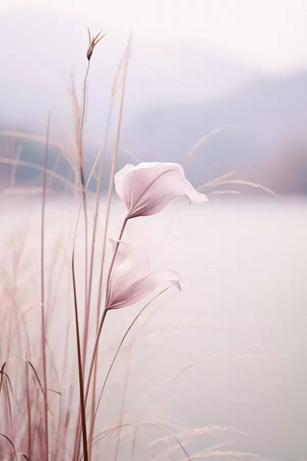 Poster Délicates fleurs roses au bord d'un lac paisible f46503