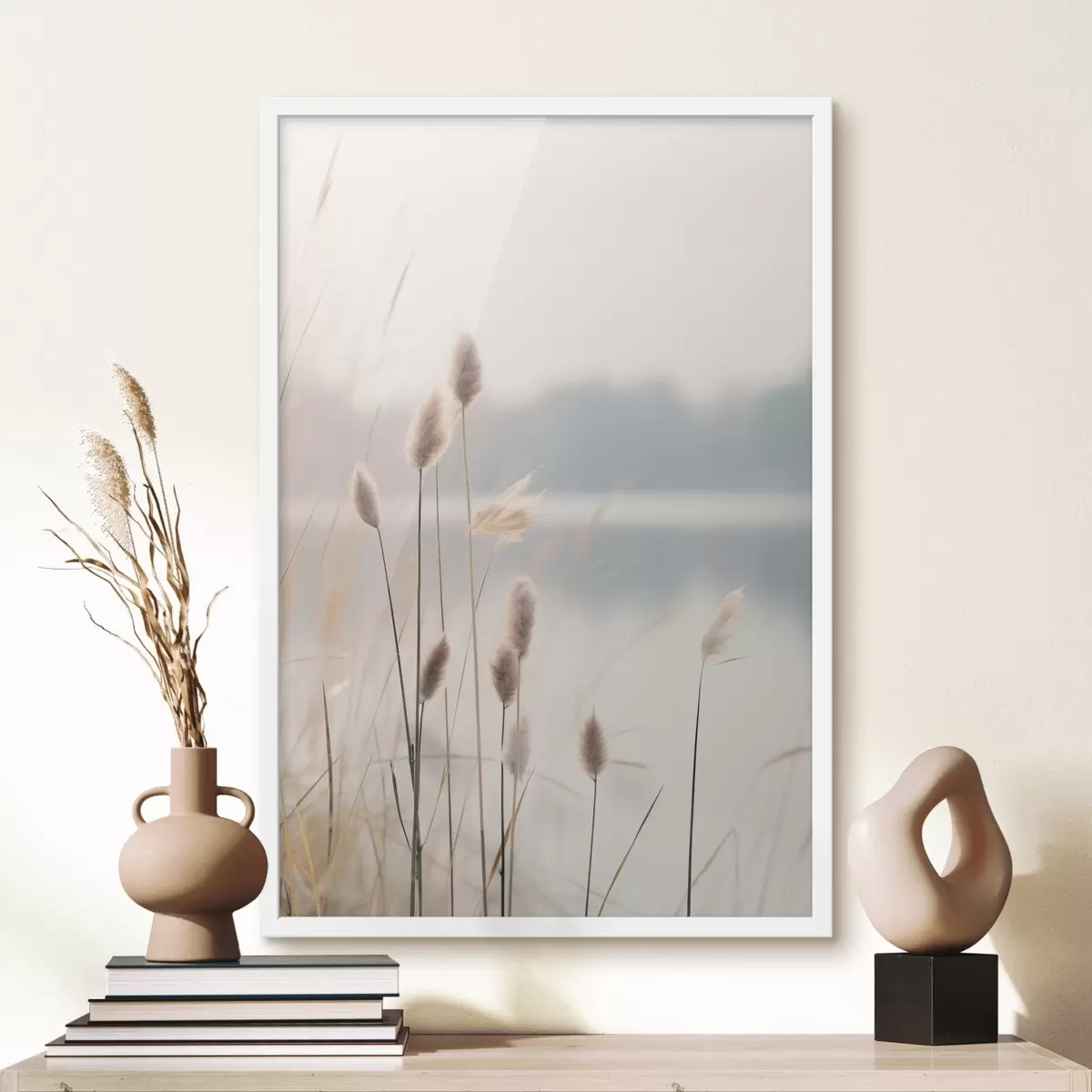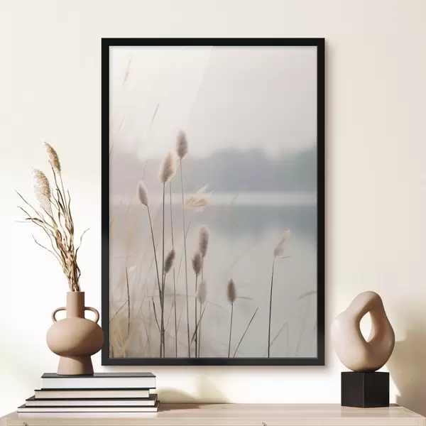 Poster Roseaux souples au bord d'un lac brumeux, tons beiges pastel Nr f46504