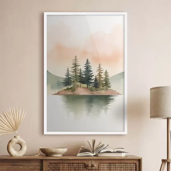 Poster Pin aquarellé sur un îlot brumeux, ciel couleur pêche tendre Nr f46505