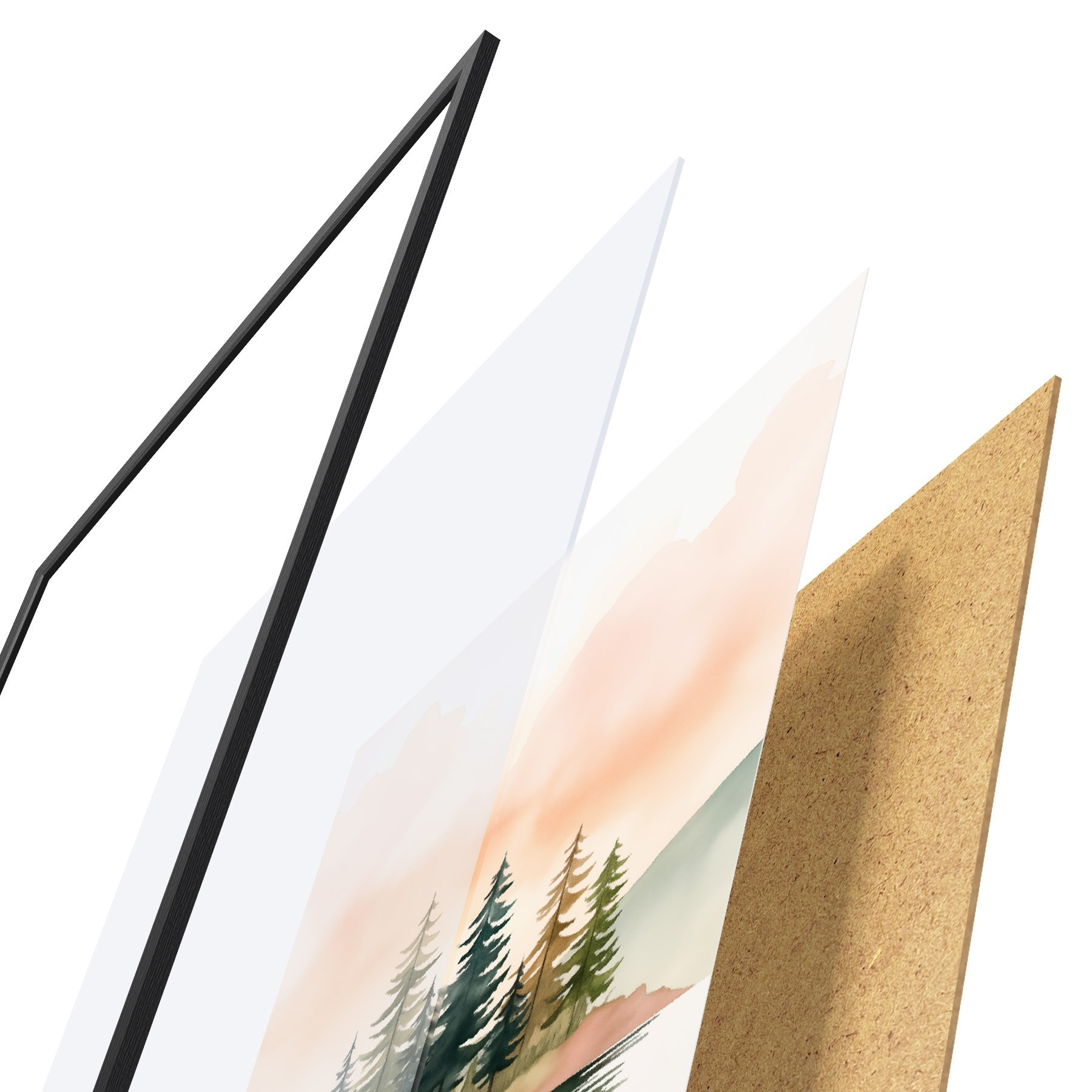 L’affiche encadrée est composée d’un cadre, d’un plexiglas, d’une image imprimée et d’un support en aggloméré. Elle est prête à être accrochée au mur grâce aux fixations situées à l’arrière.