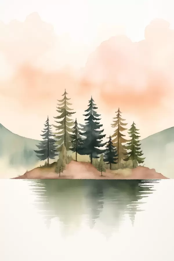 Poster Pin aquarellé sur un îlot brumeux, ciel couleur pêche tendre Nr f46505