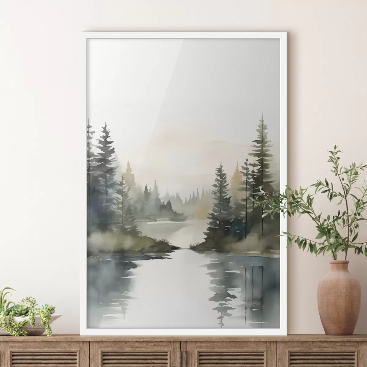Poster Forêt brumeuse de conifères au-dessus d'une rivière calme, style aquarelle Nr f46507
