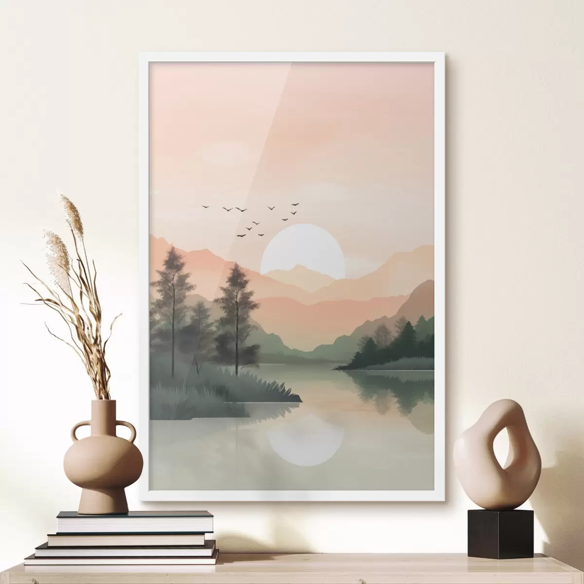 Poster Coucher de soleil pastel sur un lac tranquille avec des collines lointaines et des oiseaux f46508