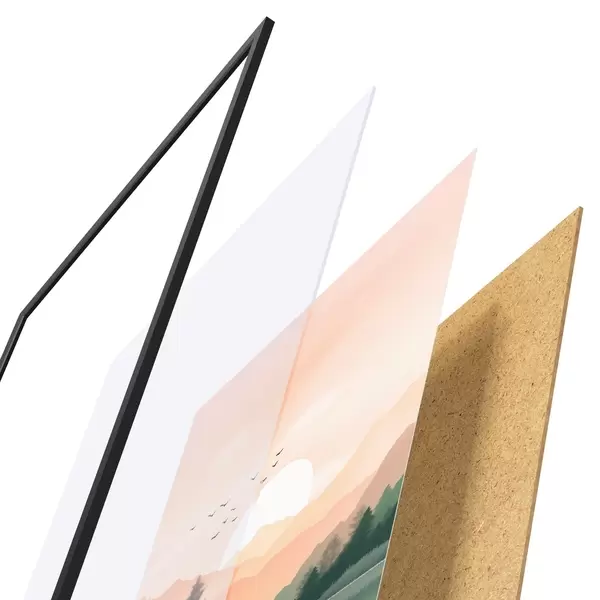 L’affiche encadrée est composée d’un cadre, d’un plexiglas, d’une image imprimée et d’un support en aggloméré. Elle est prête à être accrochée au mur grâce aux fixations situées à l’arrière.