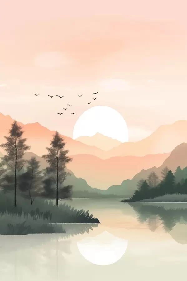 Poster Coucher de soleil pastel sur un lac tranquille avec des collines lointaines et des oiseaux Nr f46508