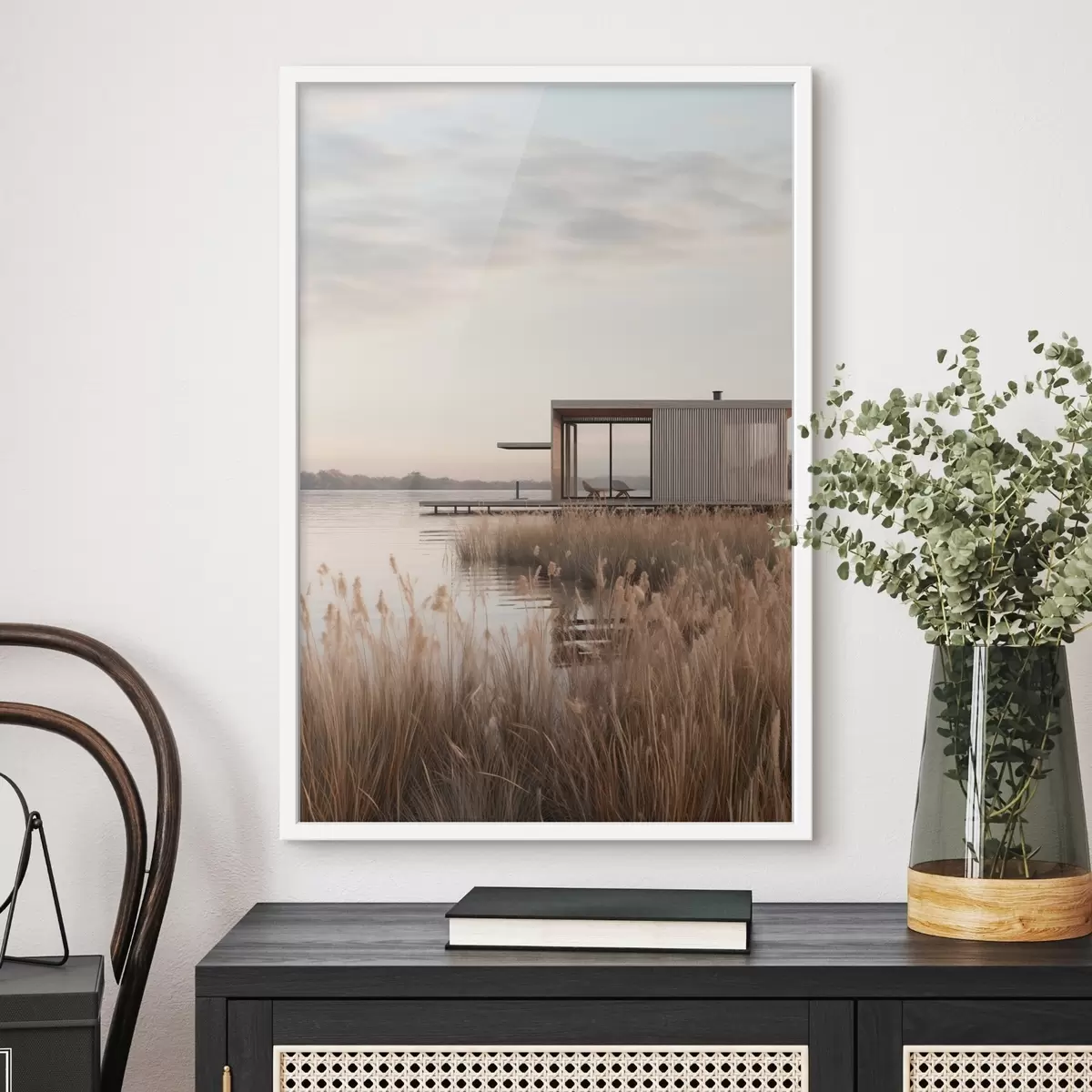 Poster Cabane moderne au bord d'un lac, parmi les roseaux, au crépuscule Nr f46513