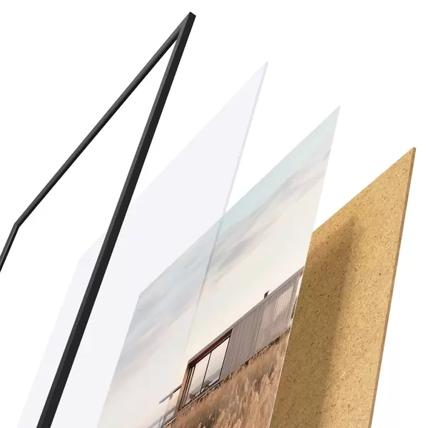 L’affiche encadrée est composée d’un cadre, d’un plexiglas, d’une image imprimée et d’un support en aggloméré. Elle est prête à être accrochée au mur grâce aux fixations situées à l’arrière.