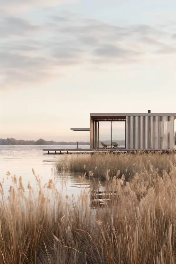 Poster Cabane moderne au bord d'un lac, parmi les roseaux, au crépuscule Nr f46513