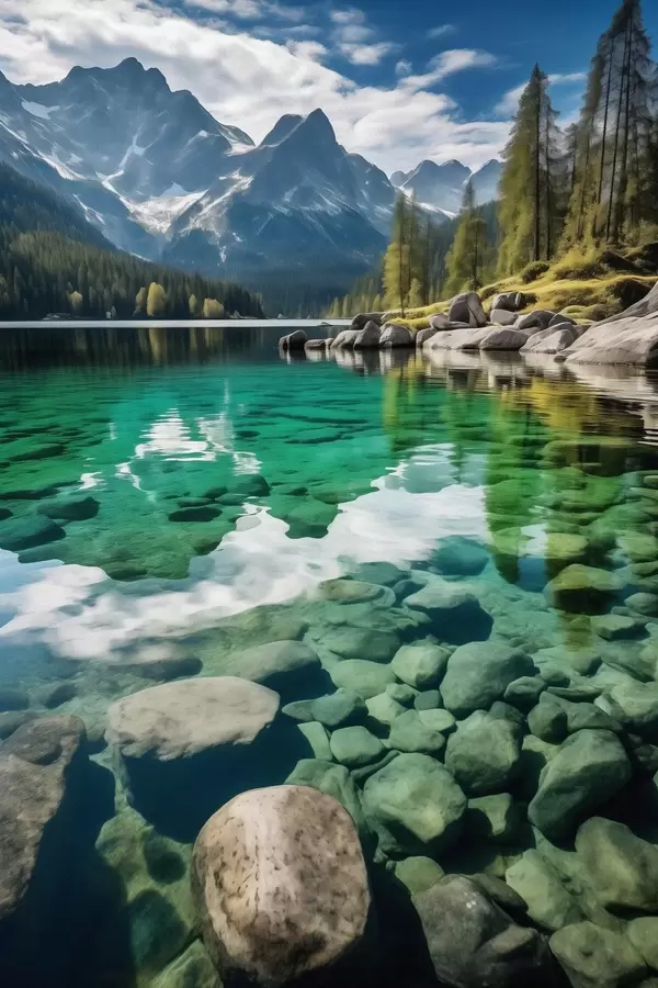 Poster Lac alpin émeraude avec des rochers en contrebas et des pics imposants Nr f46515