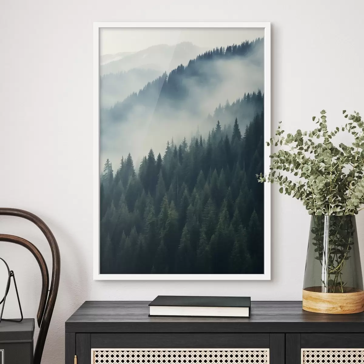 Poster Brouillard sur les pentes couvertes de conifères, tons vert foncé Nr f46516