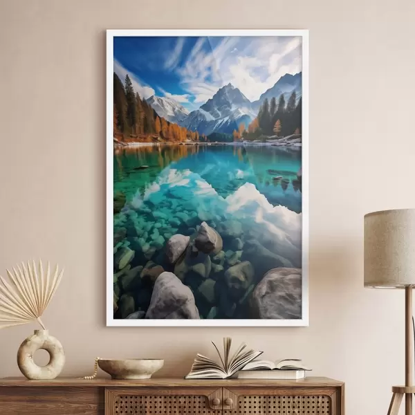Poster Lac de montagne aux eaux turquoise et mélèzes automnaux Nr f46517