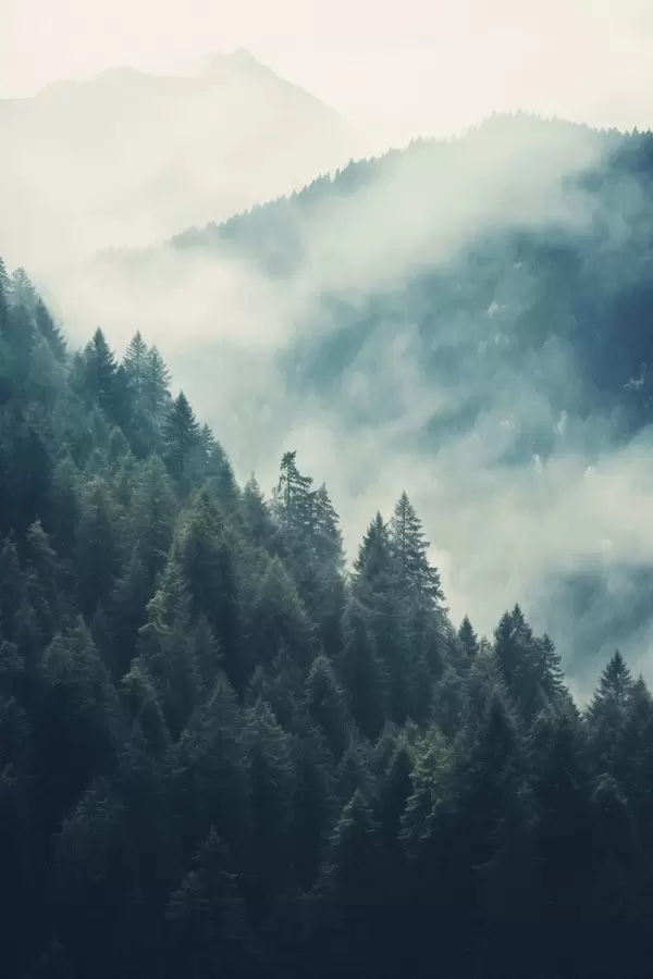 Poster Crêtes montagneuses brumeuses et forêt sombre de conifères Nr f46518