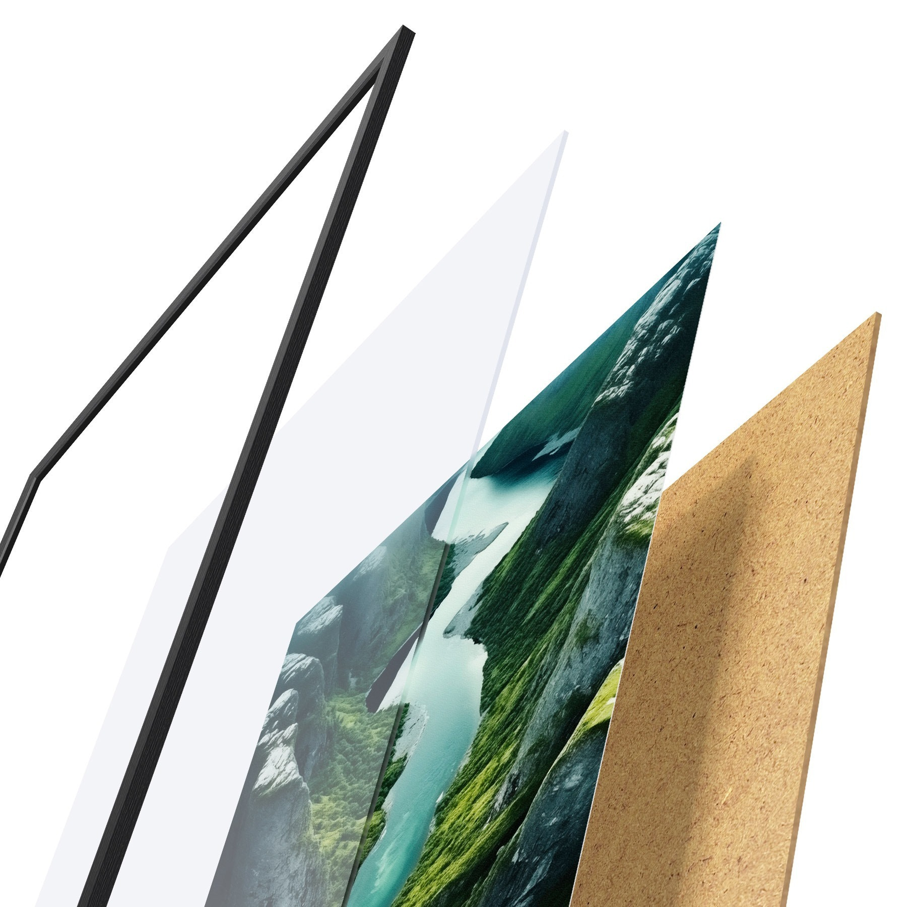 L’affiche encadrée est composée d’un cadre, d’un plexiglas, d’une image imprimée et d’un support en aggloméré. Elle est prête à être accrochée au mur grâce aux fixations situées à l’arrière.