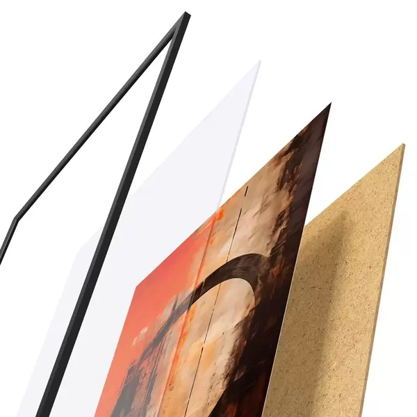 L’affiche encadrée est composée d’un cadre, d’un plexiglas, d’une image imprimée et d’un support en aggloméré. Elle est prête à être accrochée au mur grâce aux fixations situées à l’arrière.