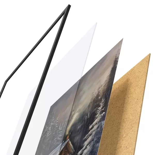 L’affiche encadrée est composée d’un cadre, d’un plexiglas, d’une image imprimée et d’un support en aggloméré. Elle est prête à être accrochée au mur grâce aux fixations situées à l’arrière.