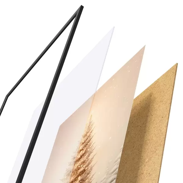 L’affiche encadrée est composée d’un cadre, d’un plexiglas, d’une image imprimée et d’un support en aggloméré. Elle est prête à être accrochée au mur grâce aux fixations situées à l’arrière.