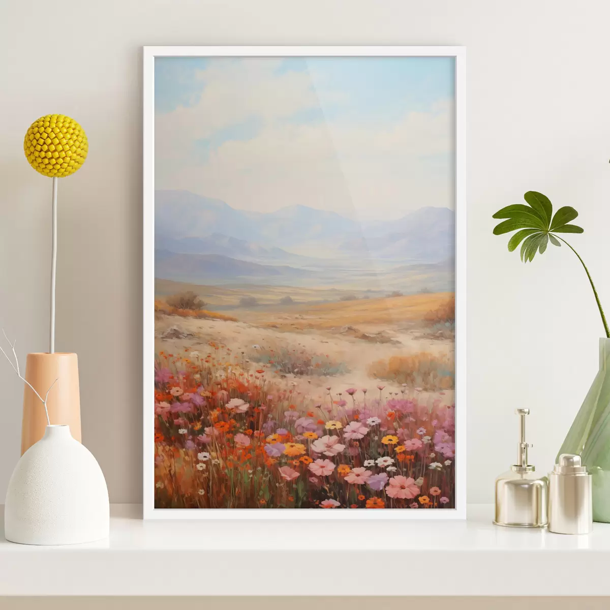 Poster Paysage, champ de fleurs colorées avec des montagnes en arrière-plan, couleurs douces et pastel Nr f46685