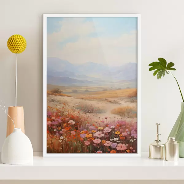 Poster Paysage, champ de fleurs colorées avec des montagnes en arrière-plan, couleurs douces et pastel f46685