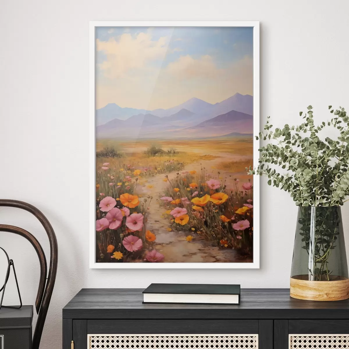 Poster Paysage, champ de fleurs colorées avec des montagnes en arrière-plan, couleurs douces et pastel Nr f46686
