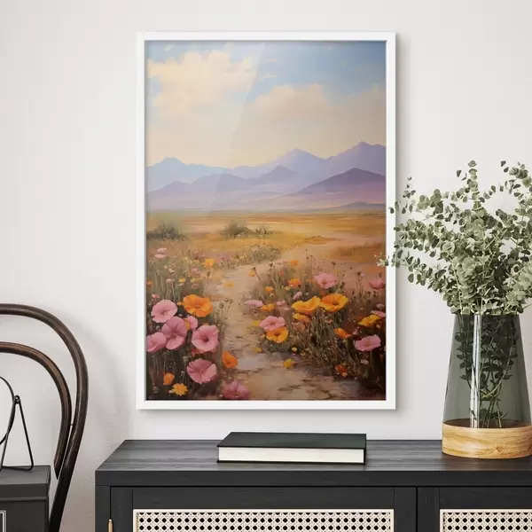 Poster Paysage, champ de fleurs colorées avec des montagnes en arrière-plan, couleurs douces et pastel f46686