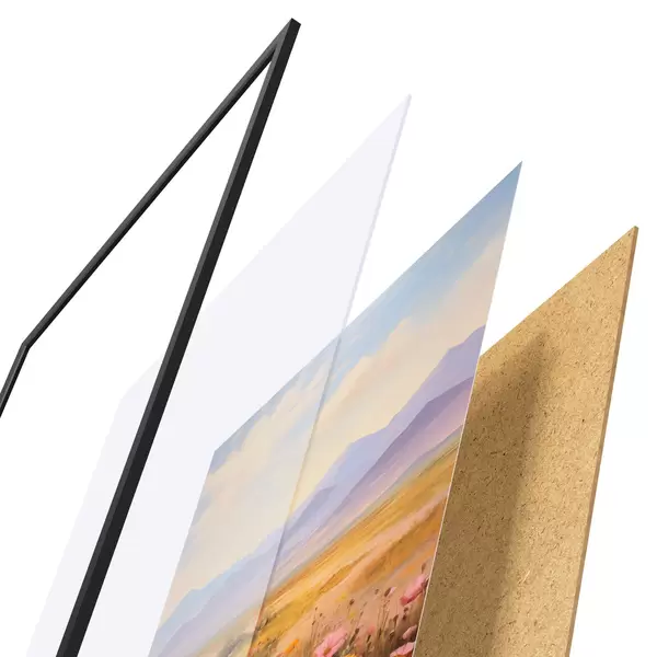 L’affiche encadrée est composée d’un cadre, d’un plexiglas, d’une image imprimée et d’un support en aggloméré. Elle est prête à être accrochée au mur grâce aux fixations situées à l’arrière.