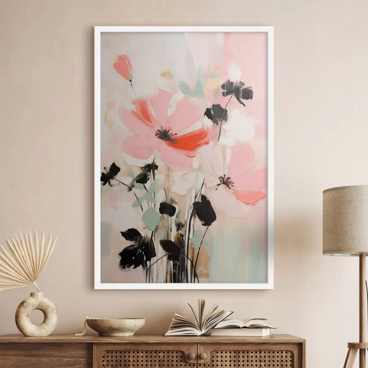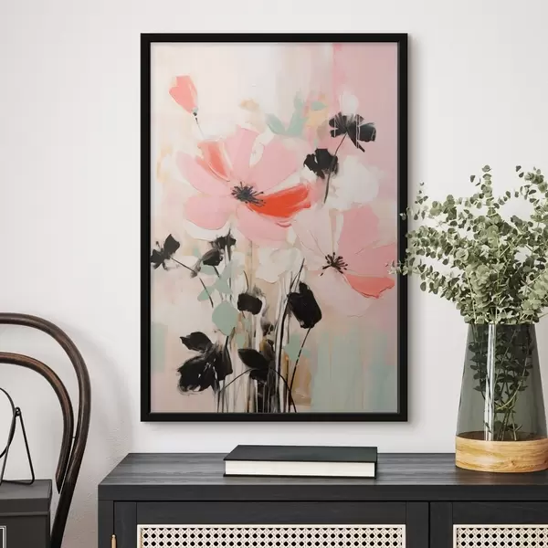 Poster Fleurs roses et noires avec des feuilles, couleurs pastel douces, composition florale abstraite, art minimaliste Nr f46687