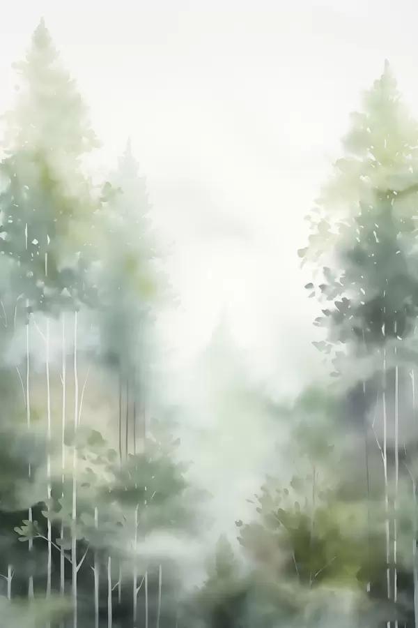 Poster Aquarelle représentant une forêt abstraite avec de grands arbres et un feuillage vert, dans des tons doux et discrets Nr f46689
