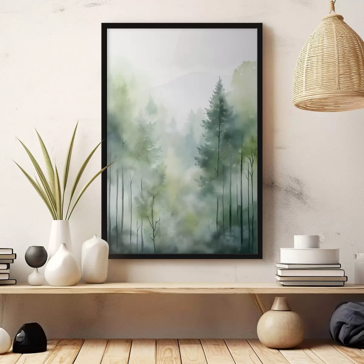 Poster Imitation d'une aquarelle représentant une forêt brumeuse avec de grands pins et des montagnes en arrière-plan. f46690